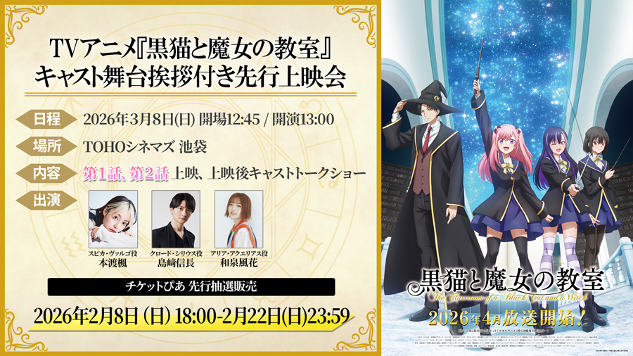 4月の放映に先立ち、キャスト舞台挨拶付き先行上映会の開催が決定‼日程は、2026年3月8日(日)。会場はTOHOシネマズ 池袋。当日は、スピカ・ヴァルゴ役の本渡楓、クロード・シリウス役の島﨑信長、アリア・アクエリアス役の和泉風花の登壇を予定。